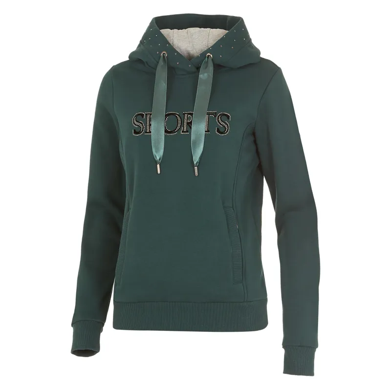 Warm ladies´ hoodie | fitted shape | zip pockets with logo zip | flock print with rhinestones on the front | hood inside with jersey and decorative ribbon | hood can be fixed | rhinestone horse on the sleeve